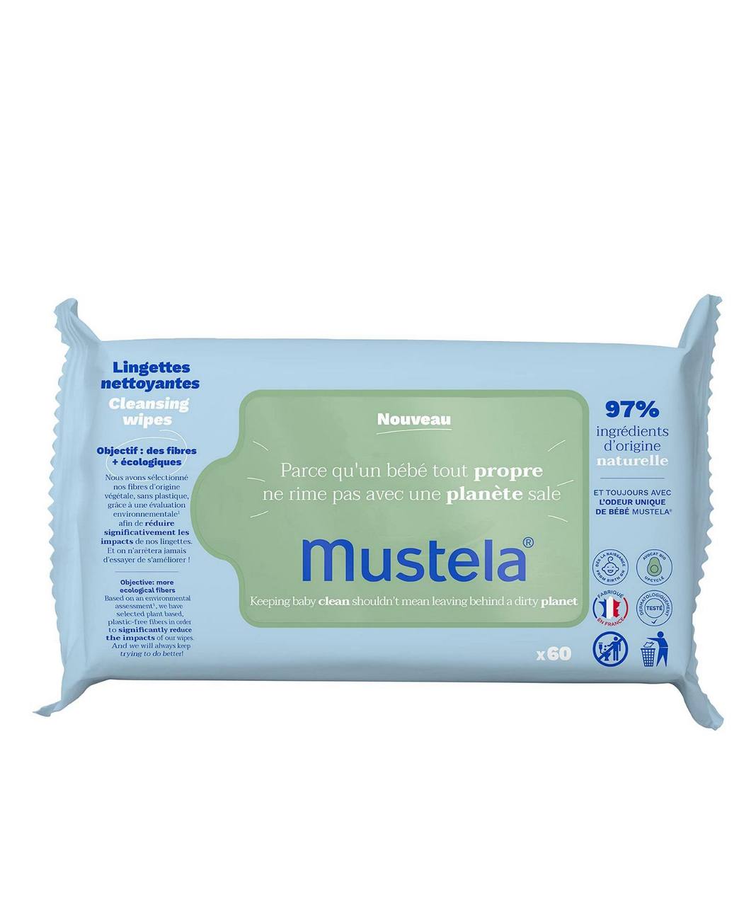 Mustela Cleansing Wipes — м’які вологі серветки для щоденного очищення шкіри обличчя, рук та зони підгузка немовлят і дітей. Формула дбайливо очищає, зволожує та заспокоює шкіру, не потребує змивання та підходить для використання вдома й у дорозі.